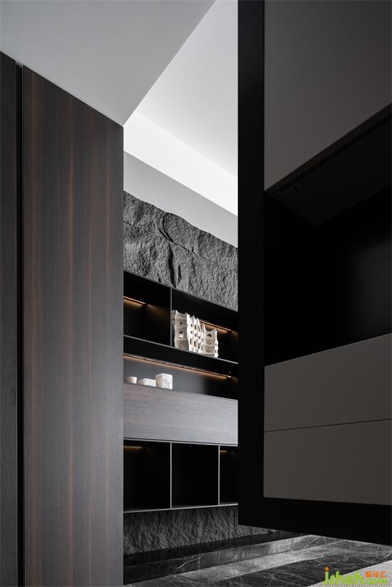 既是聚合空間,材質(zhì)的呼應(yīng)尤為重要,西廚的巖板與頂面的木皮在立面與頂面都與客廳背景部分進行了呼應(yīng)和連貫。