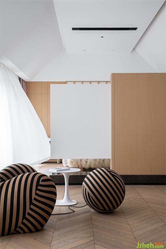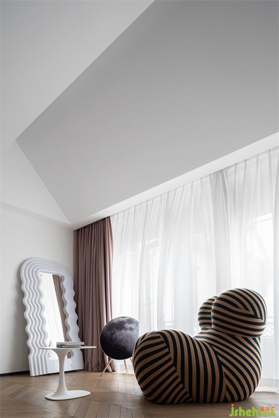 書(shū)房與床之間做了低矮的隔斷,別墅設(shè)計(jì)功能上略做區(qū)分,視覺(jué)上也保障了睡眠的隱私感。