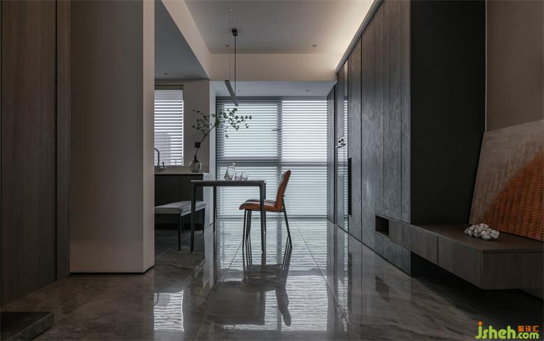 Calmness is the design fundamental key of the space, from the dark of kitchen area to the wood color of corridor to the coffee color of the living room, just have soft, texture is full.