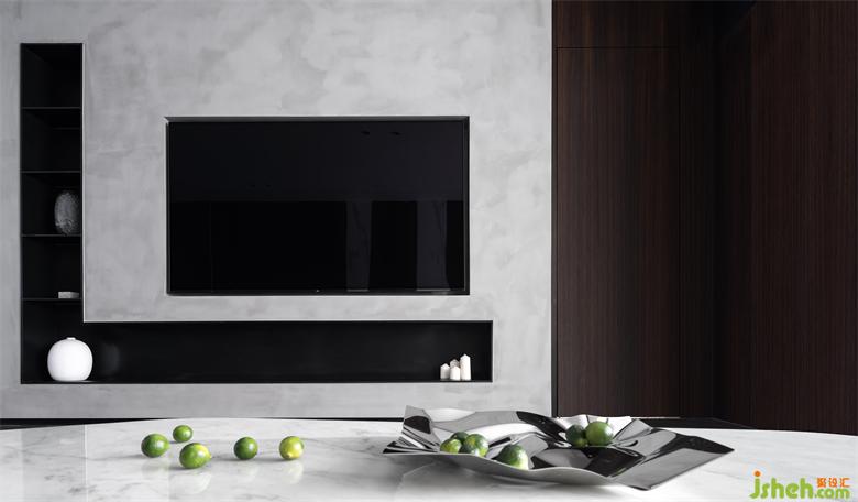 Art paint in the texture of fair-faced concrete Outlines the lines of the TV wall, while the fully embedded TV and stainless steel ultra-thin open laminates create a minimalist approach.
