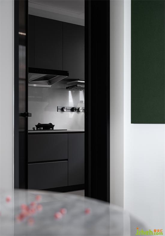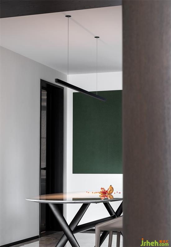 The dark green decorative painting with strong texture enhances the brightness of the space in the modern space created by wood color and black and white gray.