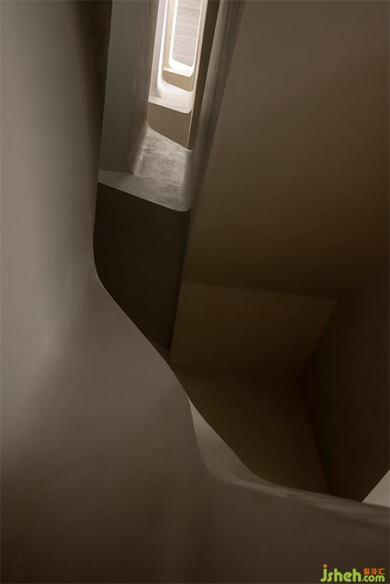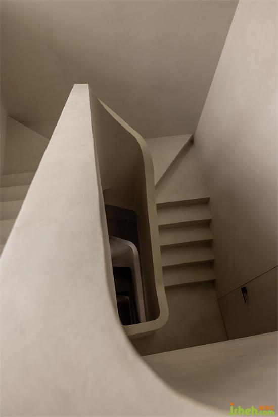 In order to retain the ultimate form of beauty, the extra material will destroy the texture of the stairs themselves, so the use of integrated micro-cement materials to cover the stairs, let the entire staircase as a building as a device to stand in this five-story deep space.