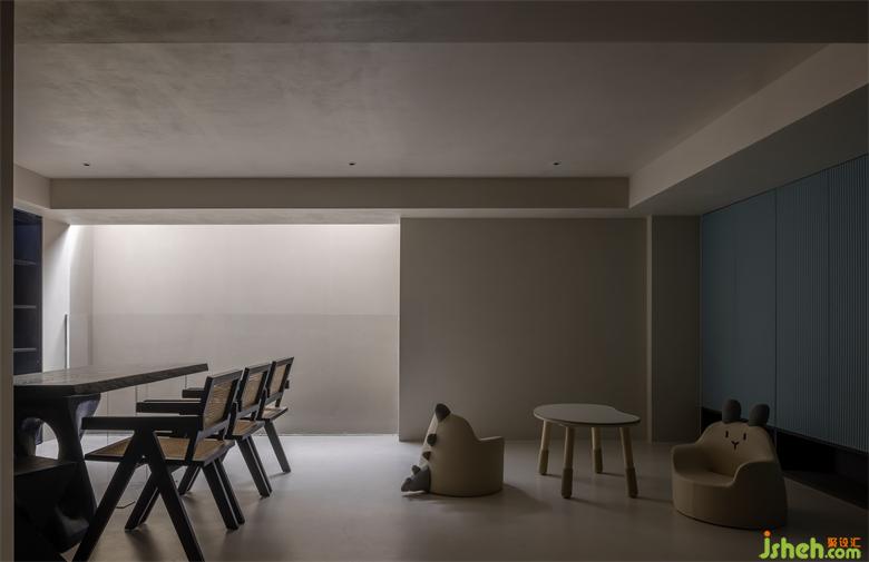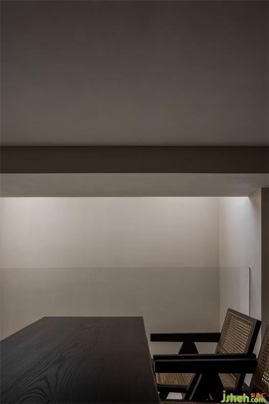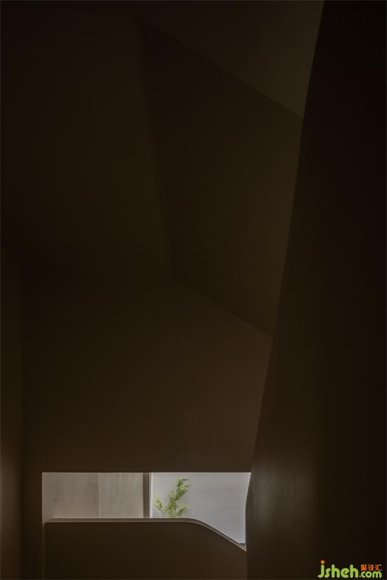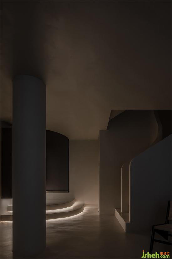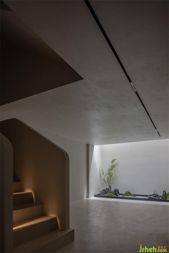 樓梯貫穿至地下空間,則再無(wú)多余材質(zhì),微水泥溫潤(rùn)的包裹著相對(duì)幽暗的空間。純粹的設(shè)計(jì)也彰顯了無(wú)即萬(wàn)象的禪宗思想。