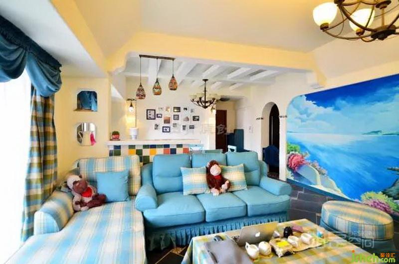 特色:本案除了具備地中海風(fēng)格的普遍特征之外,最突出的特點是:以其豐富的色系,構(gòu)成色彩斑斕的感覺。特別是手繪背景墻,凸顯了其家特有的美術(shù)氛圍。