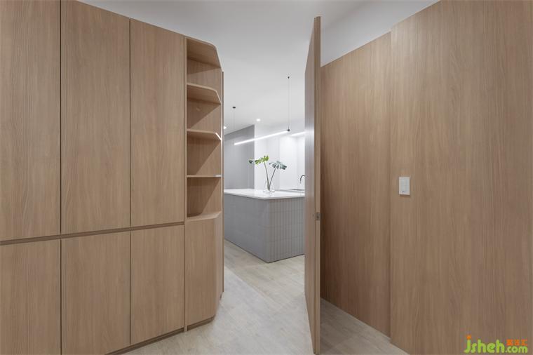 因衛(wèi)浴位置為固定不可移動(dòng),因此我們爭(zhēng)取主臥空間向外推,并賦予大量收納機(jī)能,定義空間量體,水平與垂直線(xiàn)條連貫對(duì)應(yīng),建立視覺(jué)秩序。另劃設(shè)簡(jiǎn)易化妝臺(tái)與小便間,供影片拍攝或休憩使用,平時(shí)門(mén)片為敞開(kāi)式,整面木質(zhì)語(yǔ)匯和公領(lǐng)域空間相互串連,隔而不分、界而未界。