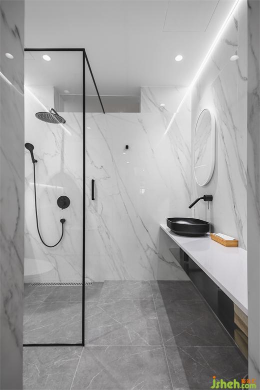 因應(yīng)公私領(lǐng)域大面積的金質(zhì)與木質(zhì)調(diào),業(yè)主希望局部區(qū)域能采用清淺石紋,于是我們?cè)谛l(wèi)浴濕區(qū)及主臥廁所、小便間,都選用大理石紋呈現(xiàn),住宅設(shè)計(jì)立面則鋪以防水性能良好的晶石板材,同時(shí)屬零醛添加的綠色材料,兼顧安全、環(huán)保與實(shí)惠效益。