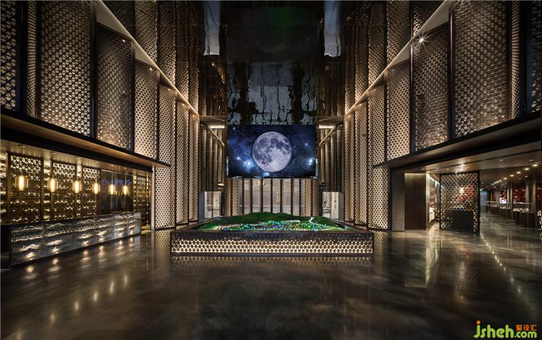沙盤區(qū)特制的黑鏡鋼天花,加上燈光的映襯,形成虛實相生的獨特意境。懸掛其中的LED屏升起“一輪明月”,并巧妙地透過黑鏡鋼天花延伸了“月球”的深邃感,與地下盡顯“綠水青山”景象的沙盤區(qū)和諧相融,營造出明朝詩人王守仁《蔽月山房》的哲學意境。裝修公司