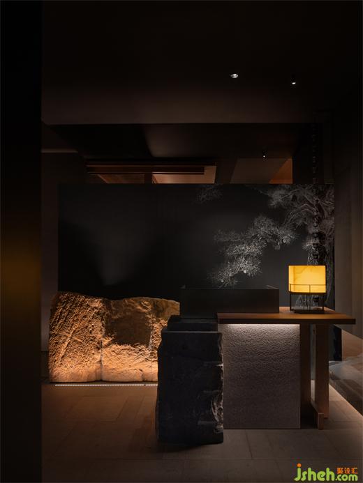 松聲靜夜聞,月光涵露重。空間欲揚先抑,素黑幽玄的環(huán)境中包含著對自然的敬意和縮影,雪松、巖石、明月,如在筆墨間。日料餐廳設(shè)計建筑并未寓意過多,沉寂幽玄的光影帶來的克制讓觀者將悲喜收于內(nèi),卻也牽出夢的絲線,掛于松雪之末,月隱婆娑處。