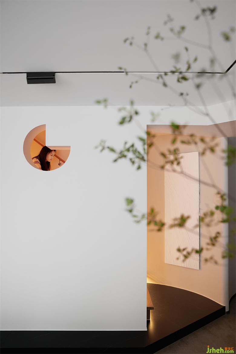 樓梯與客廳隔墻上的鏤空時鐘圖形,削弱了整面白墻的單調(diào)性,家裝設(shè)計增加了空間趣味,同時使樓梯與客廳擁有互動性,豐富居住者的體驗感。