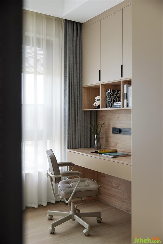書房簡潔有序,深色沙發(fā)為空間注入理性的沉穩(wěn)感。書桌收納柜一體化,給室內(nèi)預(yù)留出自由的活動空間,家裝設(shè)計讓空間擁有更多可變性,滿足業(yè)主不同居住階段的使用需求。