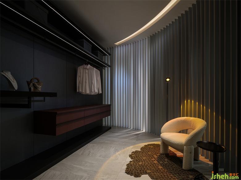 衣帽間在落日燈的斜輝下顯得靜謐而氛圍感十足,簡約柔和的沙發(fā),中和了洗練線條的硬朗,在豐富的光影里,展廳設計空間也被烘托得極具層次感。