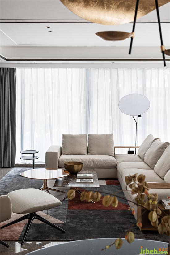 客廳以素雅色調(diào)為主,簡(jiǎn)凈大方,采用FLEXFORM大轉(zhuǎn)角沙發(fā),帶書架的扶手設(shè)計(jì)方便平時(shí)隨手放置書籍。別墅設(shè)計(jì)別具特色的POLIFORM長(zhǎng)圓組合式茶幾,為空間更添層次感。