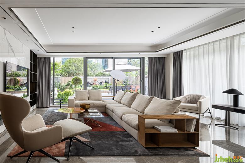 大面積的落地窗將室外光線引進(jìn)來,讓室內(nèi)更加通透明亮。