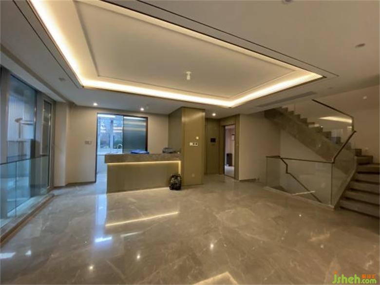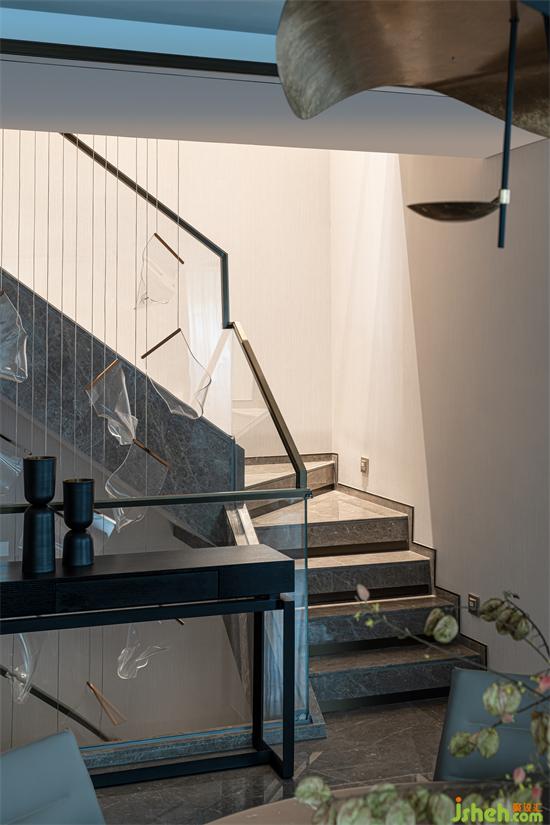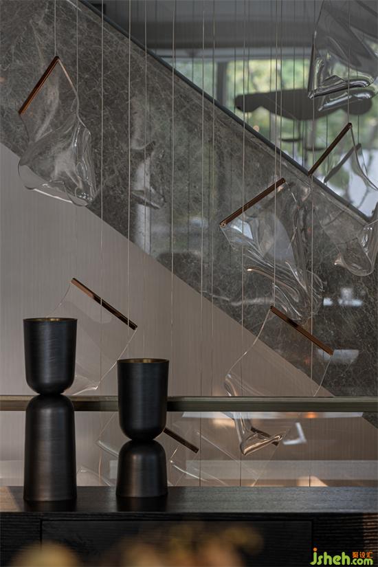理性的折線樓梯搭配垂墜的透明吊燈,和諧之余,別墅設(shè)計(jì)也將空間勾勒得更富肌理感。