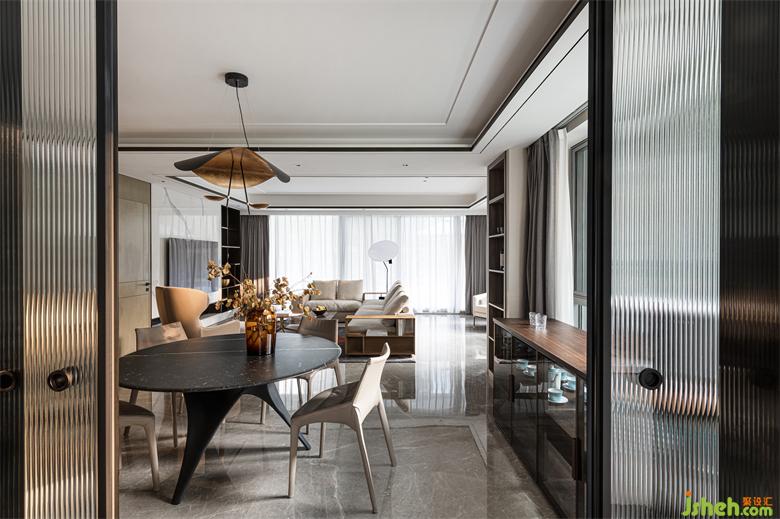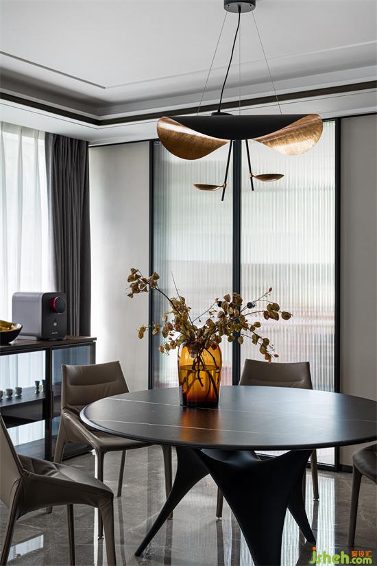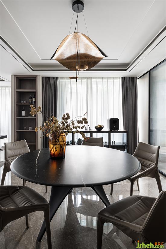 客餐廳貫通一體,視野開闊。別墅設(shè)計(jì)餐桌采用特殊磨砂處理的MC大理石臺(tái)面,質(zhì)感溫潤,避免了光面帶給人的冰冷感。