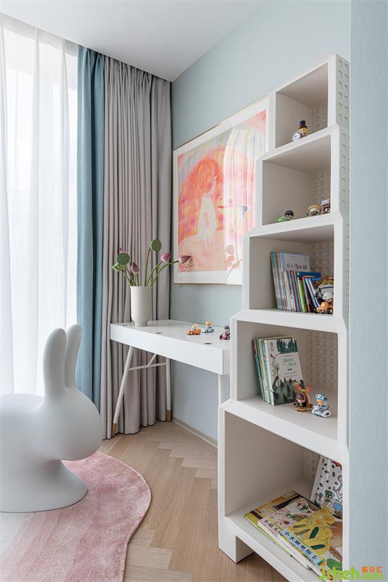 增加書柜面積,預(yù)留未來(lái)的寫作區(qū),同時(shí)為愛美的女孩設(shè)計(jì)了一面全身穿衣鏡。