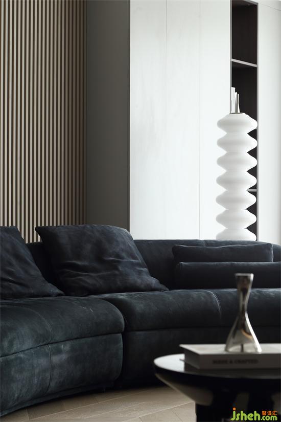 深藍色的弧形沙發(fā)營造出溫馨的圍合感,保證了坐感的舒適度,滿足朋友相聚時的圍坐暢聊。