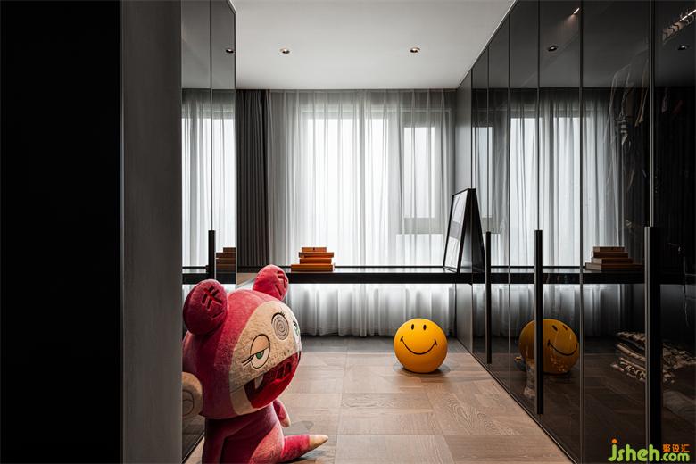 衣帽間收納有序,可愛的卡通玩偶,彰顯著居住者大男孩般的游戲之心,笑對(duì)生活,樂觀灑脫。