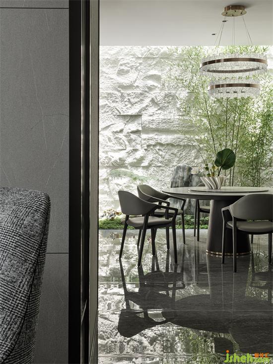 客餐廳通透的動線讓家人間的溝通交流更加方便,塑造著彼此間更為深刻的情感鏈接。別墅設(shè)計綠意裝飾的餐廳,在家中的很多角度進(jìn)行觀看都能達(dá)到一種園林造景的意趣。