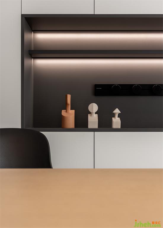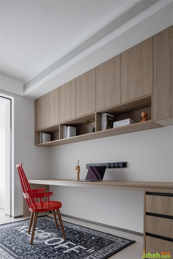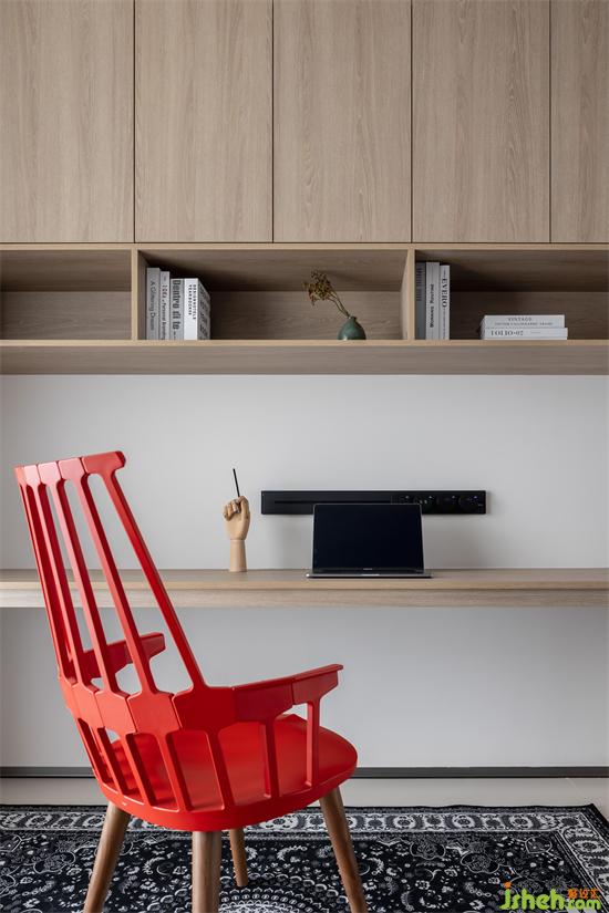 書房設置吊柜進行收納,簡單整潔。沉靜的木色營造出安靜的工作學習氛圍。家裝設計紅色的座椅,充滿讓人醒目的熱情,使整個空間活力十足。