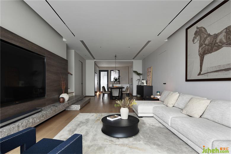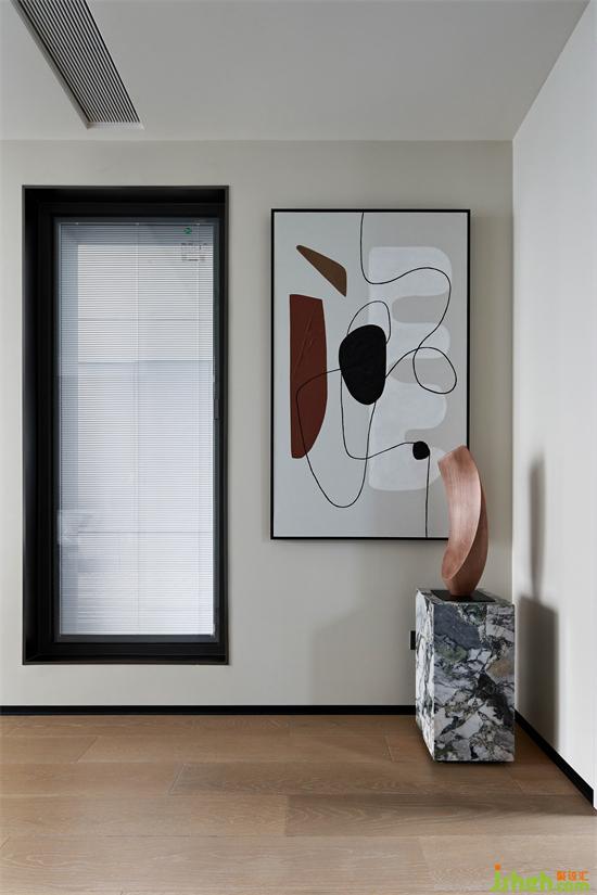 樓梯將空間劃分為樓下的社交休閑空間和樓上的私人休息空間,公私空間有著明確的區(qū)分,互不干擾。抽象版畫(huà),麓湖蕓臺(tái)漫躍層裝修設(shè)計(jì)以極簡(jiǎn)線條與圖形的碰撞,呼應(yīng)了整個(gè)空間的設(shè)計(jì)調(diào)性。