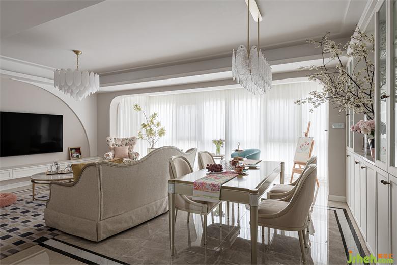 餐廳的布置依舊延續(xù)整個空間的浪漫格調(diào),成都遠洋萬和公館裝修設計以弧形元素增加雅致感,選用與客廳相呼應的花瓣形吊燈,脈絡分明,頗具精雅質感。