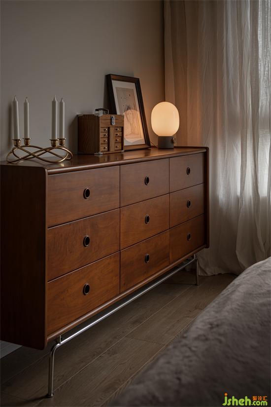整個(gè)空間的置物遵循少而精的原則,篩選后的物品也都盡可能保留屋主的審美個(gè)性。家裝設(shè)計(jì)斗柜采用深色木質(zhì)與金屬的組合,精致考究,自然質(zhì)樸。