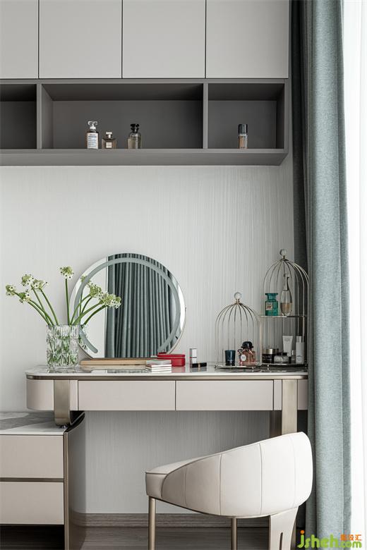 梳妝臺(tái)設(shè)計(jì)簡(jiǎn)約,家裝設(shè)計(jì)以柔雅的白色調(diào)為主,桌椅的金屬元素,流露出輕奢質(zhì)感。充足的收納滿足化妝品的合理放置。清芬綠植的點(diǎn)綴,讓空間顯得生氣盎然。