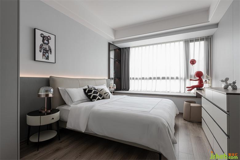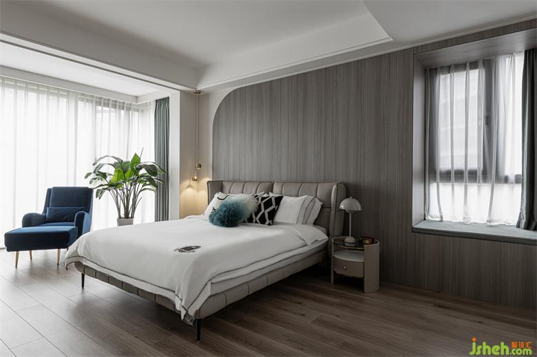 主臥空間明亮開(kāi)敞,讓人步入其中即有一種視覺(jué)上的放松感。主臥的背景墻采用木質(zhì)弧形設(shè)計(jì),紋理細(xì)膩,頗具質(zhì)感。