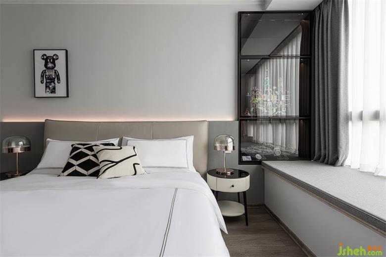 背景墻以灰色的深淺進(jìn)行過(guò)渡,背后溫馨的燈光為舒適的休憩提供了絕佳的條件。黑色玻璃展示柜中陳設(shè)著居住者喜歡的樂(lè)高積木,家裝設(shè)計(jì)凸顯著其獨(dú)特的個(gè)性愛(ài)好。