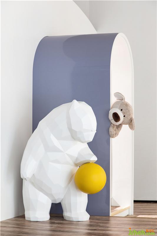 設計者對購房者產生的共情,基于能進入他人的情境,感受他人的情緒,才能最終引發(fā)共鳴?;诮ㄖw本身的格局,設計者從成人考慮的安全性、兒童使用的體驗感雙重需求出發(fā),既從動線和材質上滿足安全性,讓兒童處于家長的視線范圍之內,并以旭輝集團專為兒童區(qū)打造的小熊IP為主題,為孩童們打造了一處童話樂園,也讓成人心生對于美好生活的憧憬。