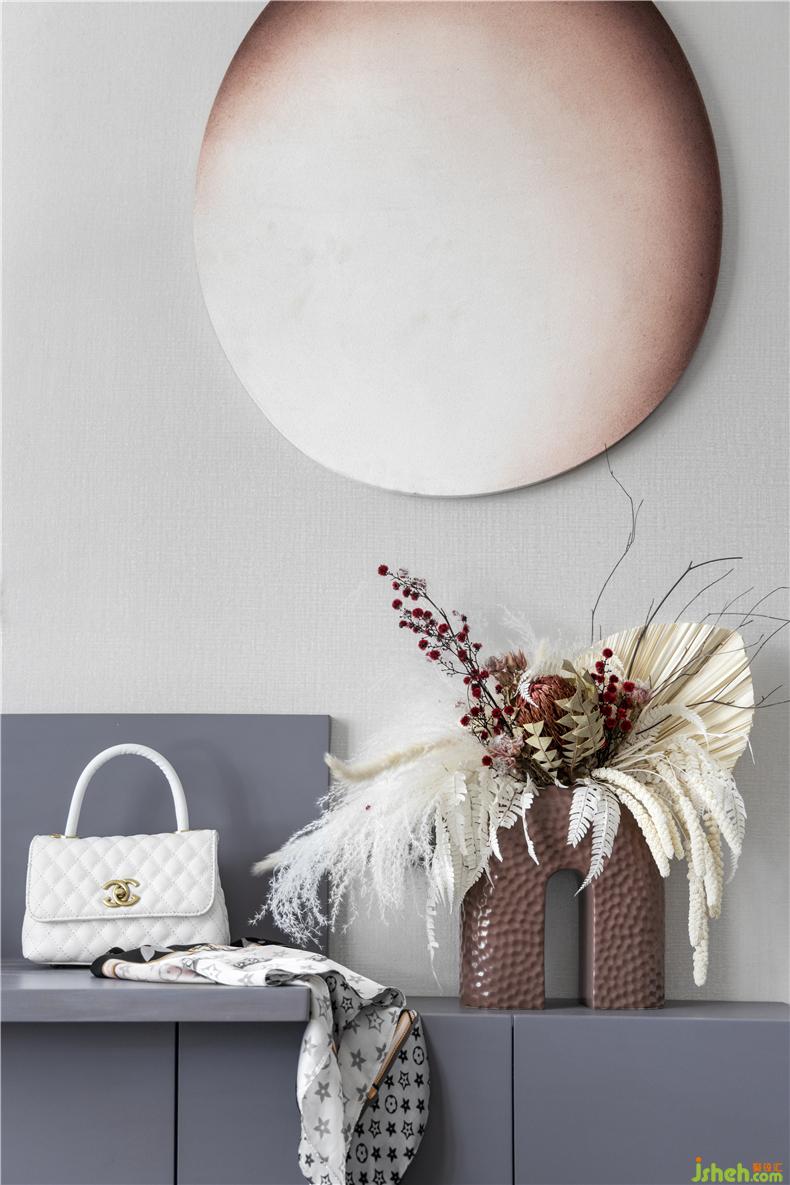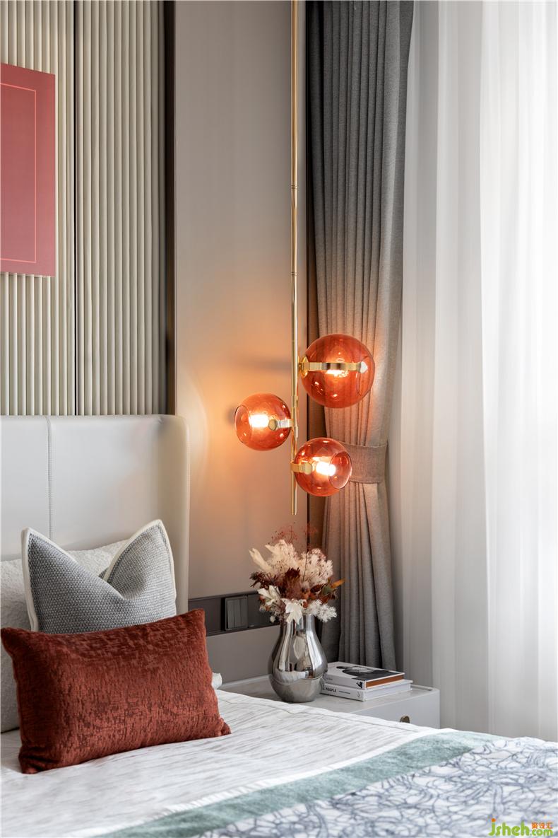 主臥運用莫蘭迪色系進行區(qū)域劃分,不爭不搶、不濃重、不妖嬈,高級又低調(diào)。梳妝臺墻面上升起滿月,仿佛在訴說著夜晚的浪漫。主臥不同材質(zhì)飾品與整個空間相得益彰樣板房設(shè)計。