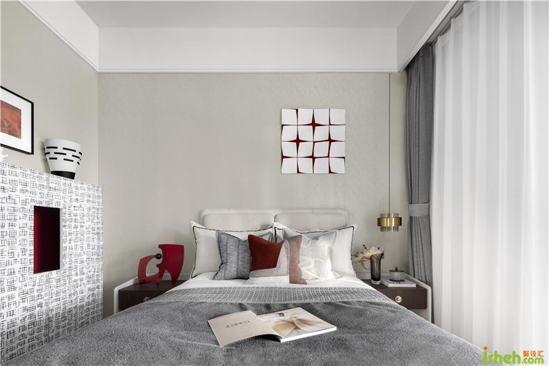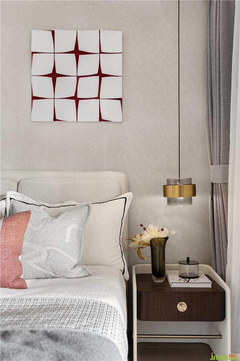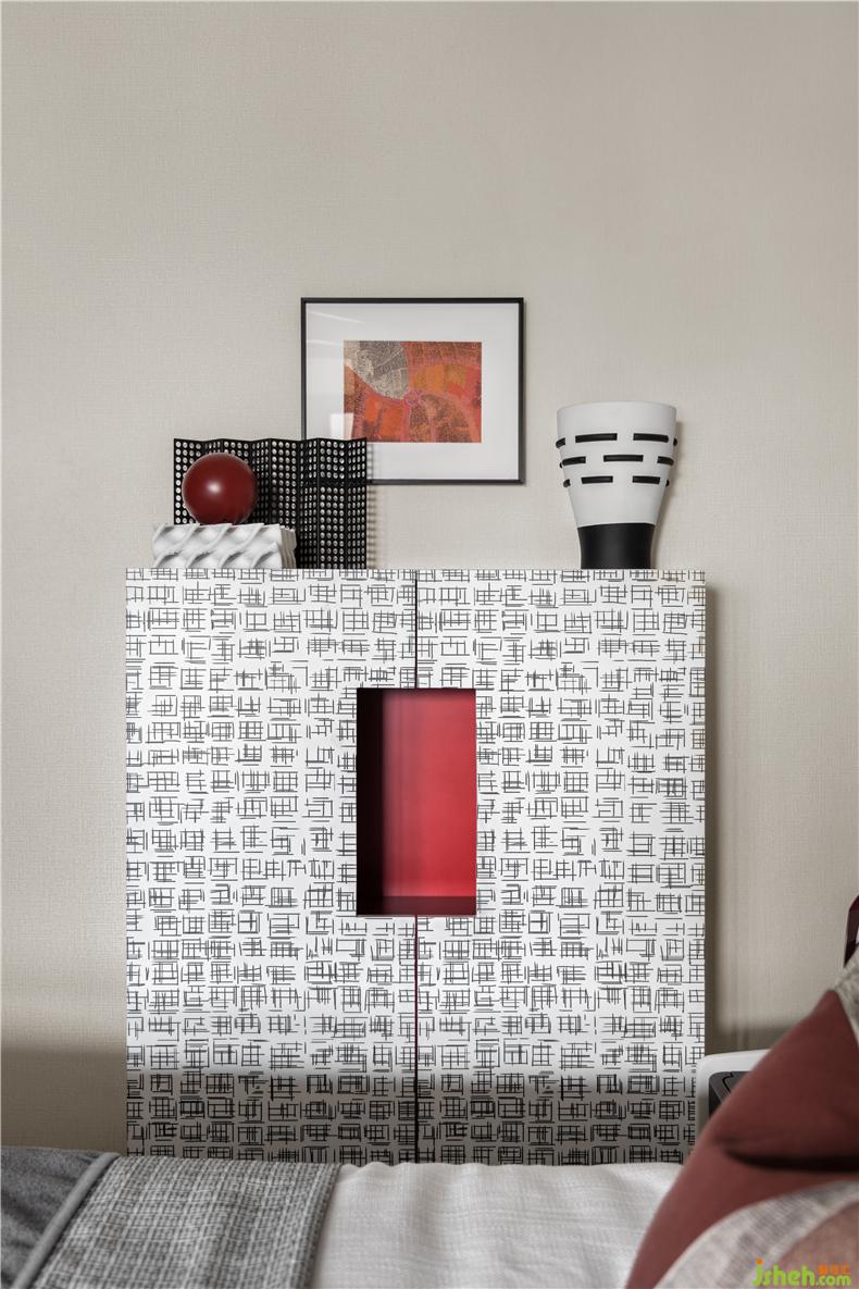 次臥斗柜如一幅抽象畫,又如一件藝術(shù)品,兼具收納又將生活美學(xué)表現(xiàn)得淋漓盡致。樣板房設(shè)計次臥背景墻面立體幾何紅白裝置物,與斗柜、織品遙相呼應(yīng),穿梭在時間與空間的隧道中