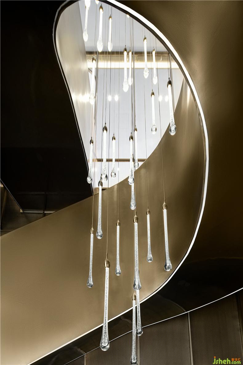 線(xiàn)在物理世界是以邊界的形式存在的,而感官世界里線(xiàn)是一種尺度的認(rèn)知,它的意義不來(lái)自于自身,而來(lái)自如何被形容。沿著墻、循著光,按著動(dòng)線(xiàn)進(jìn)入樓梯拾級(jí)而上金色綢緞自然回旋的樓梯,室內(nèi)設(shè)計(jì)師可靜觀可動(dòng)賞,錯(cuò)落式的燈光裝置如雨幕降落,底部鏡面裝置反射燈光出如夢(mèng)如幻的,俯瞰光影舞動(dòng)。