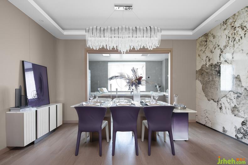 客廳與餐廳的界限被模糊,令家居生活的中心區(qū)域更加集中。樣板房設(shè)計(jì)木質(zhì)與大理石是純粹理性的代表,在之中融入神秘的圣羅蘭紫,是居住者在理性思維下的感性表達(dá)。