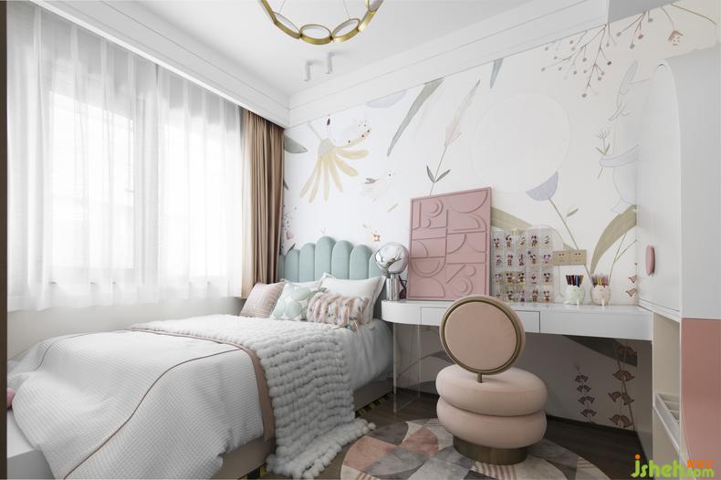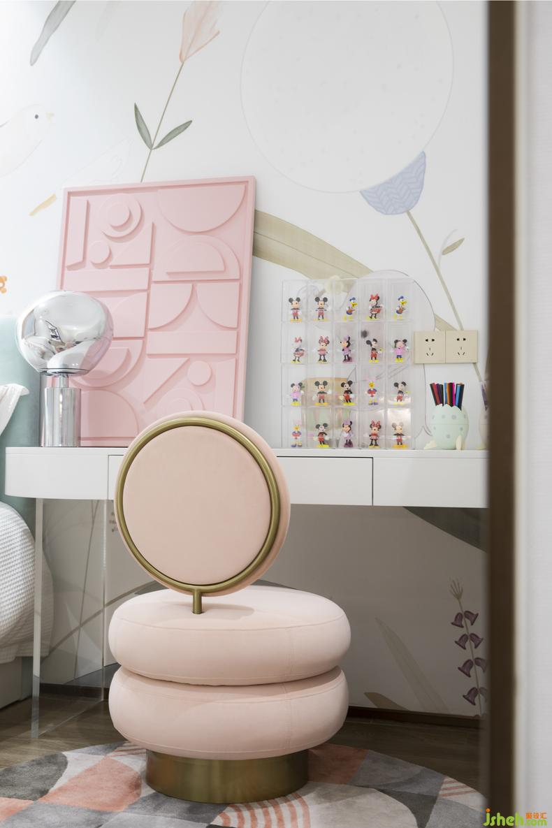 馬卡龍色系是女兒房的主調?;ú莶瀹孅c綴的墻面、樣板房設計浪漫粉色的幾何掛畫,都將天真爛漫的空間性格娓娓道來。