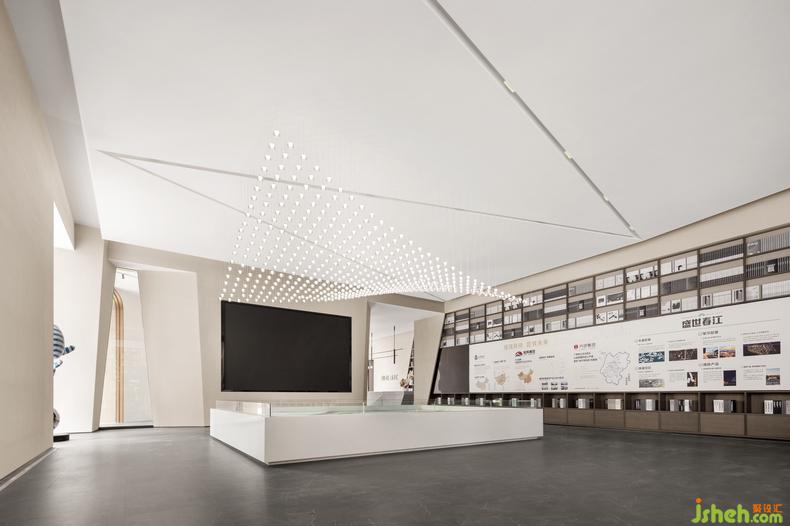 吊頂?shù)乃囆g(shù)裝置燈飾以“谷水潺潺,木落翩翩”的姿態(tài)呈現(xiàn),原木材質(zhì)的空間底色輔以流水的曲線造型,一動一靜,于山谷悠揚(yáng),賦予空間“水到渠成”的寓意,為整體氛圍更添一份意蘊(yùn)。