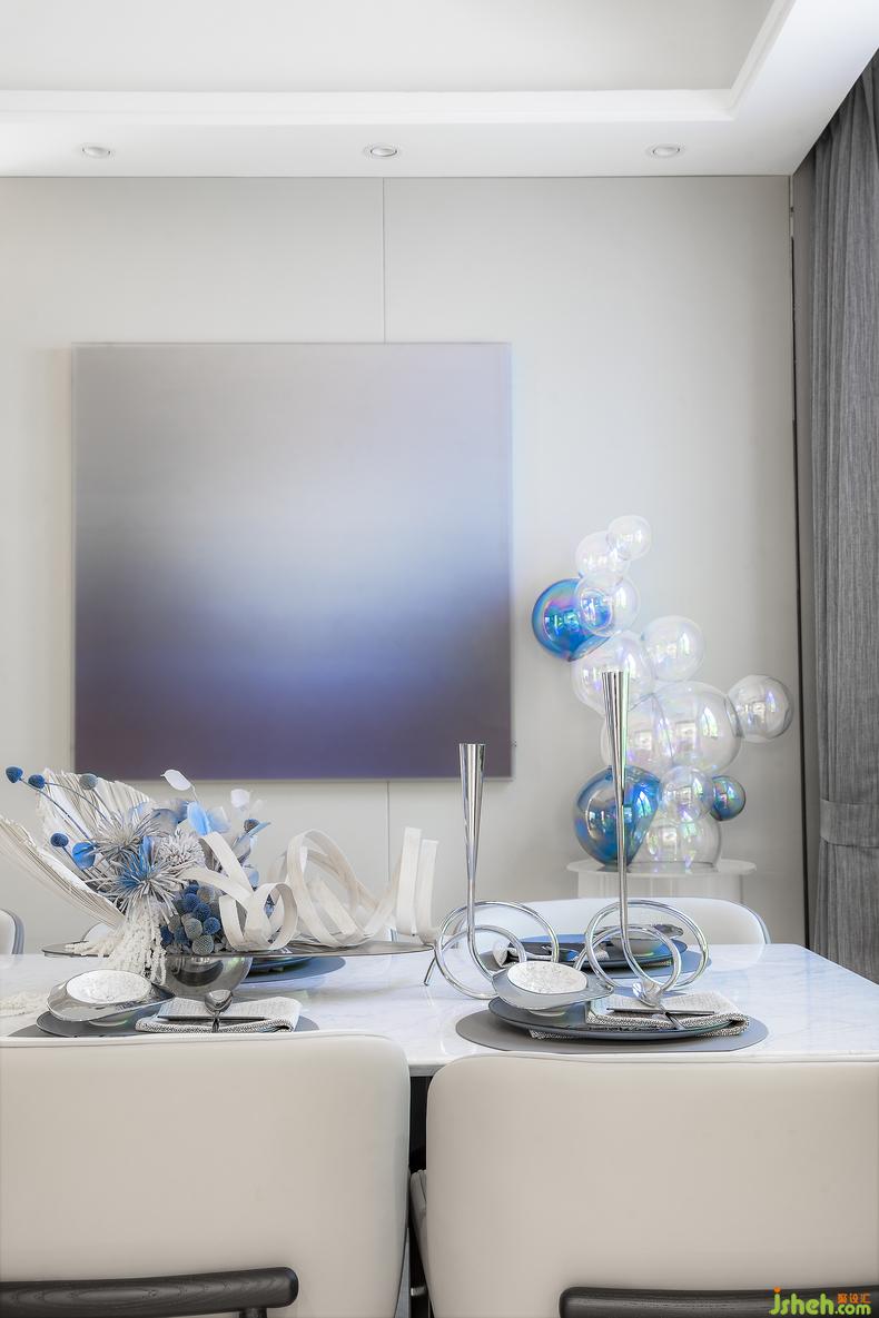 球型組合裝置和漸變抽象掛畫體現(xiàn)當(dāng)代藝術(shù)審美,海藍(lán)色彩與通過材質(zhì)呈現(xiàn)的潔白讓整個餐廳簡約又不失靈動色彩。
