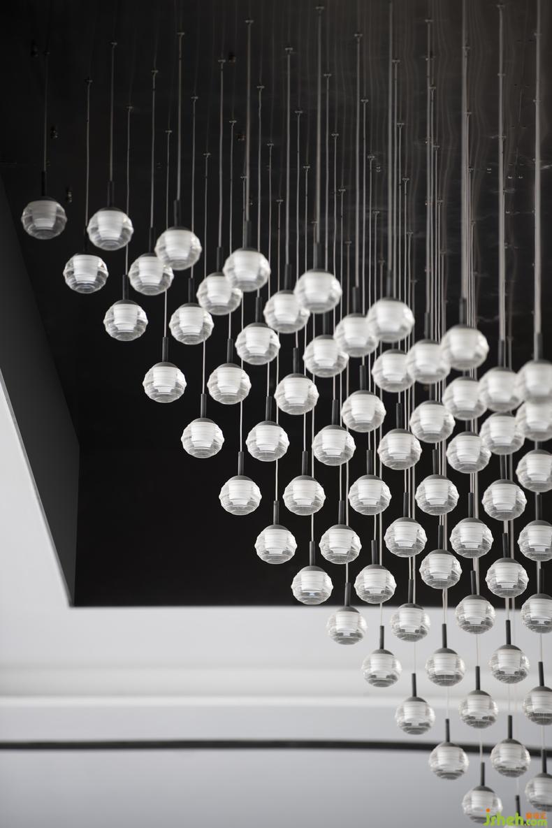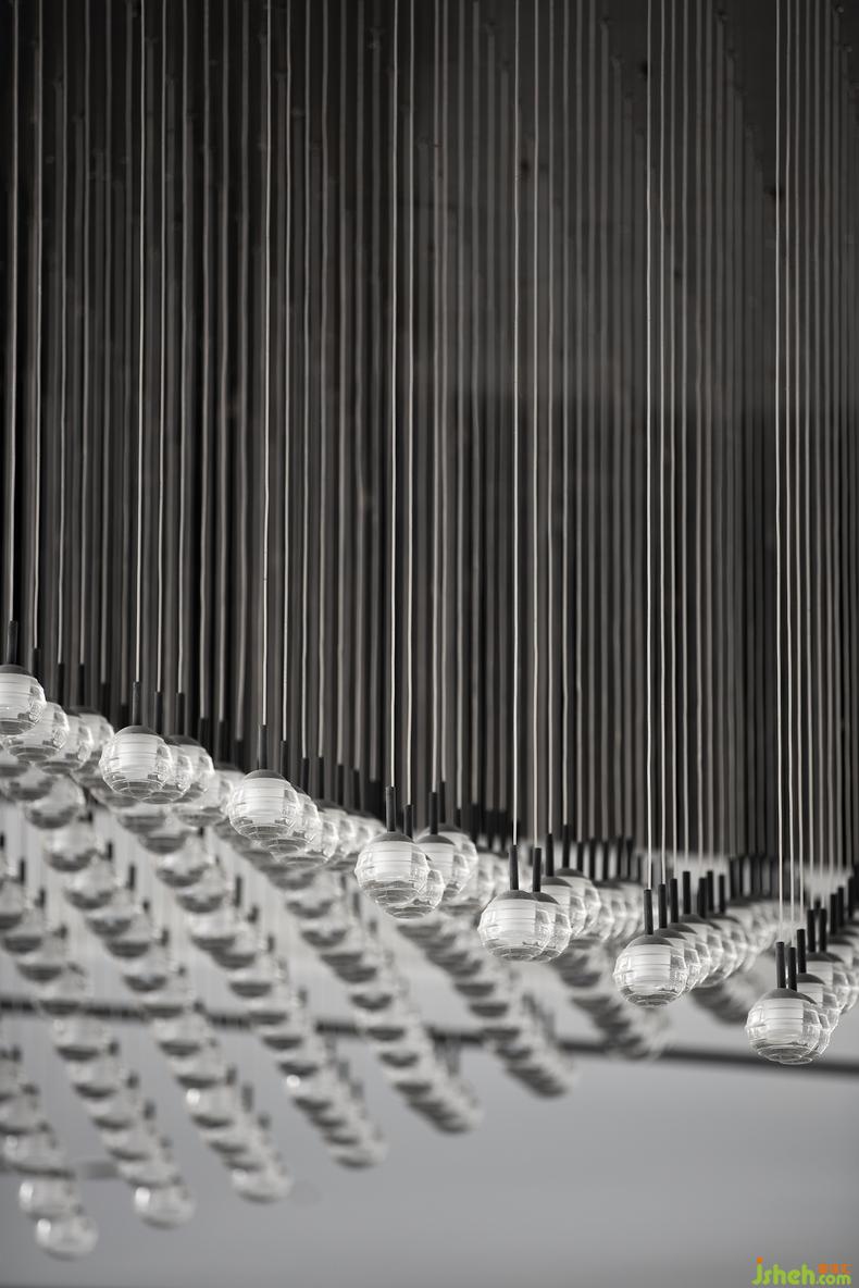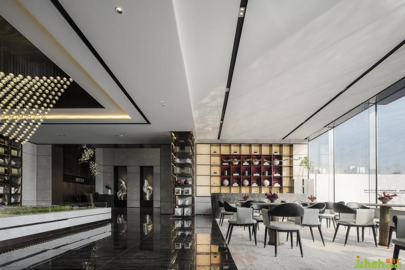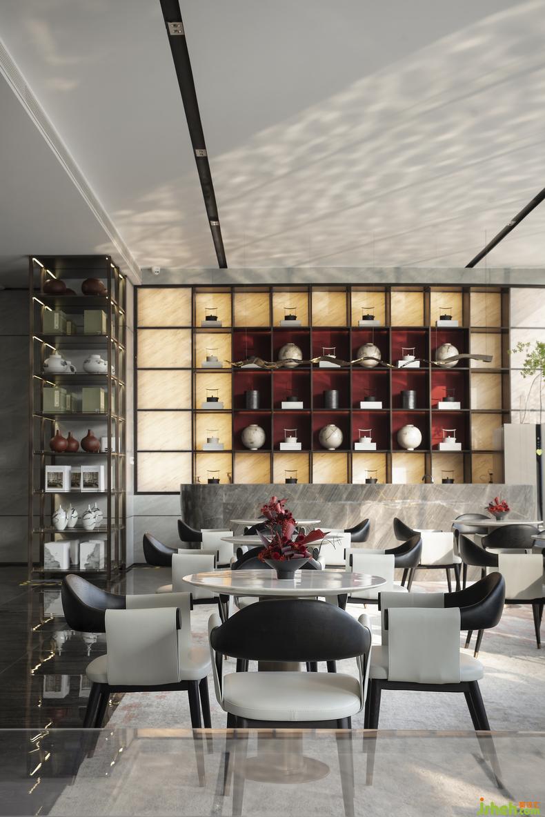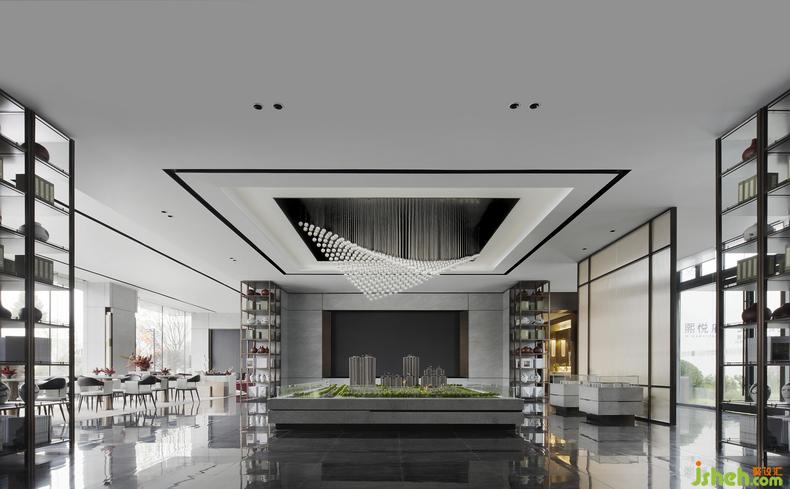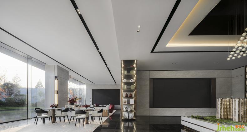 水吧延續(xù)這份古韻,整個空間在灰白色調(diào)上點綴丹秫跟金屬色,售樓處設(shè)計搭配出對比感極強的置物柜作為肌理分明的大理石吧臺背景。而上方懸空的藝術(shù)燈飾如同浩蕩水流,帶著人們感受空間的韻律感,將那故事娓娓道來。