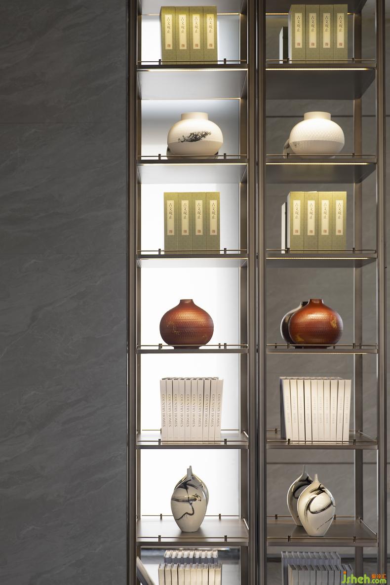 水吧和洽談區(qū)與沙盤區(qū)自然過渡,區(qū)域間沒有阻隔,視野開闊,古典大氣之感。令人眼前一亮的藝術(shù)藏品展示架貫穿空間縱伸方向,營造氛圍,用泛著歲月痕跡的藏品去訴說新沂文化。置身其中,真切感受到東方韻味,回味悠長。