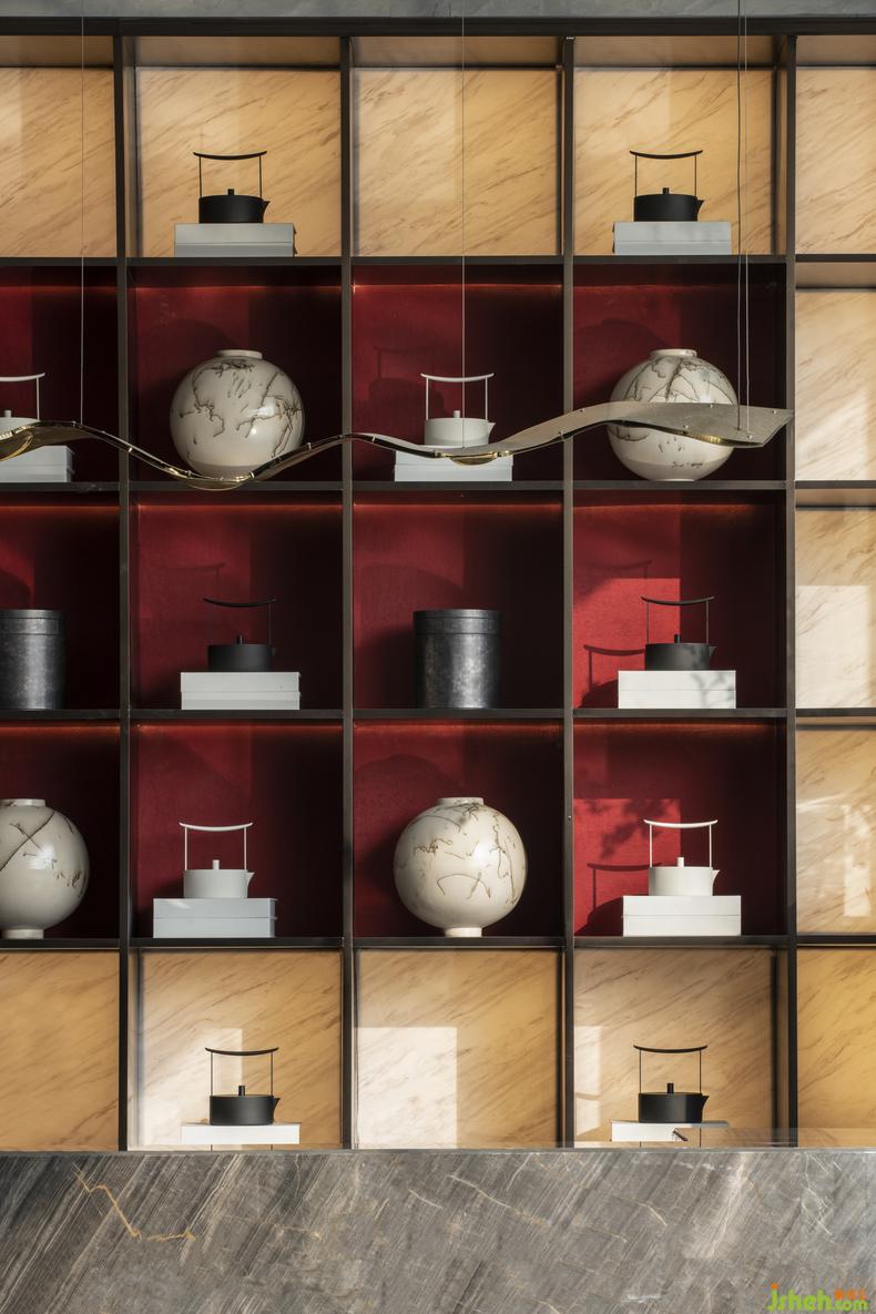 來到空間末端的深度洽談區(qū),深色墻面安靜有力地坐落在尾端,透過錯落有致的光影對比,售樓處設(shè)計營造更加私密的互動空間,于感官轉(zhuǎn)化人們對空間場域的體驗。
