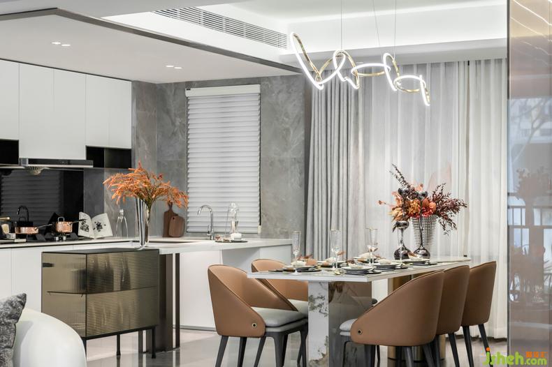 餐廳桌椅選用相同大地色系的輕奢皮椅,放置肌理感的柜子與其搭配,尚石設計歲月在優(yōu)雅間流淌。
