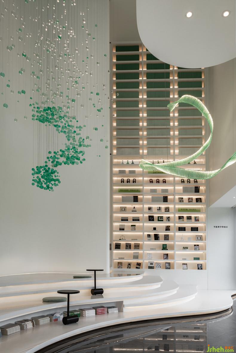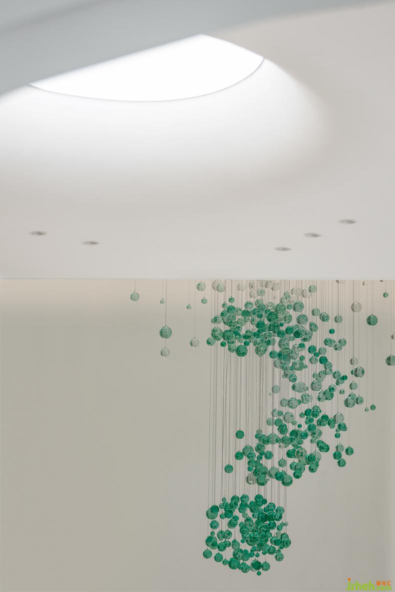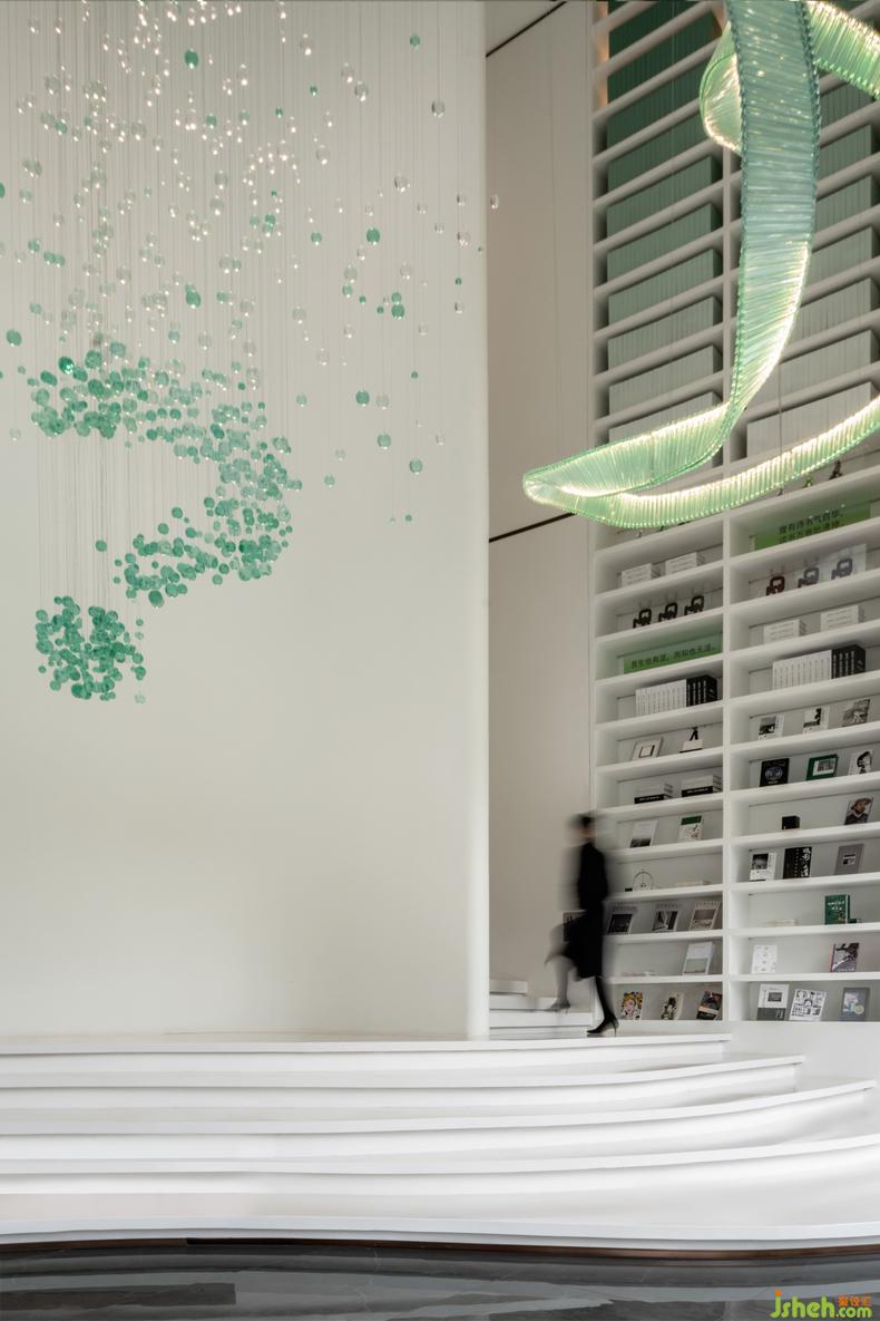 翡綠靈動玻璃吊飾懸于書吧一側(cè),為簡約的自然空間中注入了活力,想象力躍于眼前,似能聽見其清脆碰撞的鈴丁,捕捉著空間中造訪者的目光