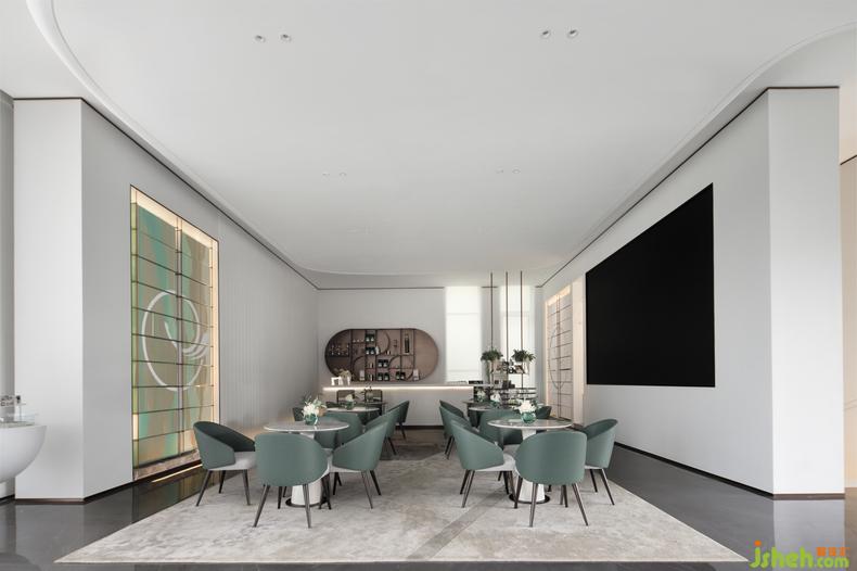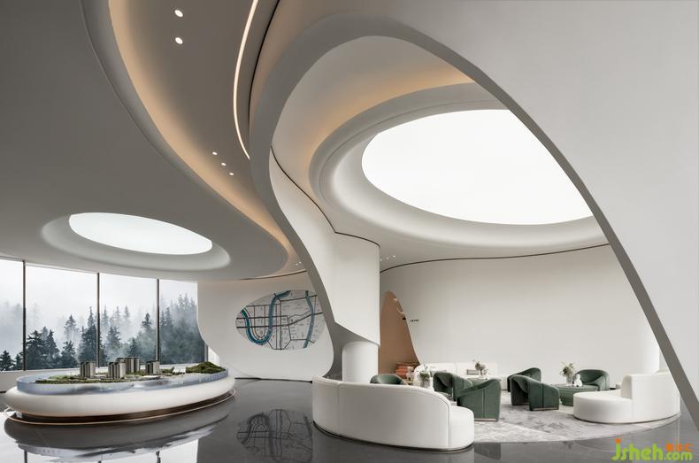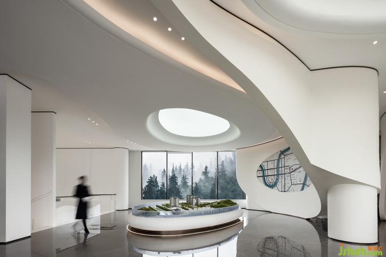 售樓處設計流動的線條與建筑結(jié)構(gòu)融會貫通,在點線面,方與圓,直與曲的變換延伸,碰撞融合中,集建筑、藝術(shù)、自然與生活于一體,形成高辨識度的曲面立體視覺形象和記憶點。