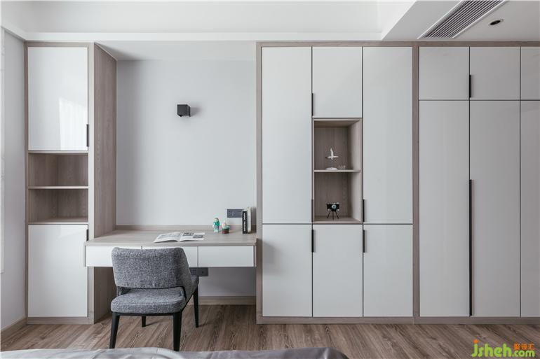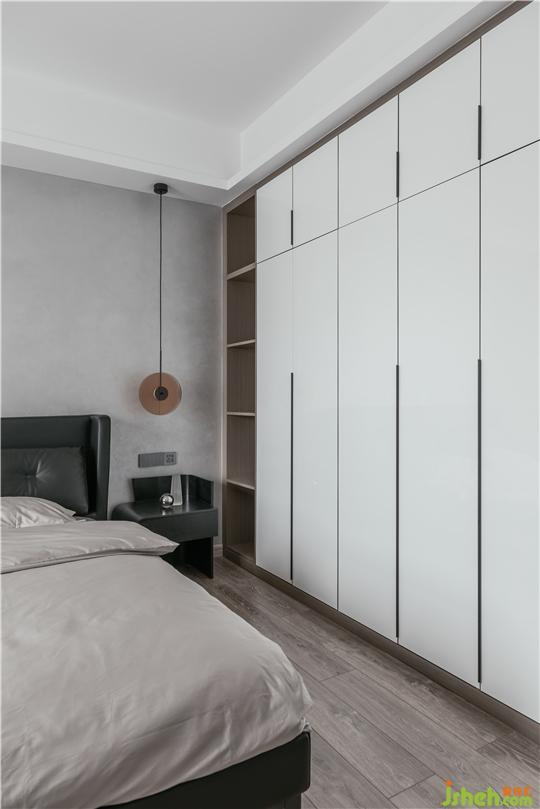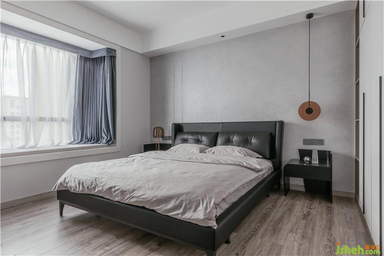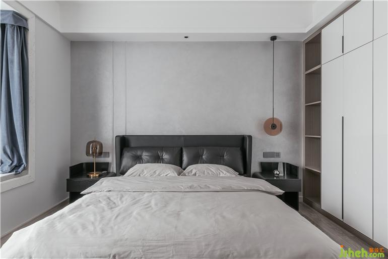 主臥暖灰色藝術(shù)漆做背景,讓整個空間溫潤而有質(zhì)感,藝術(shù)氣息在整個空間暢游。