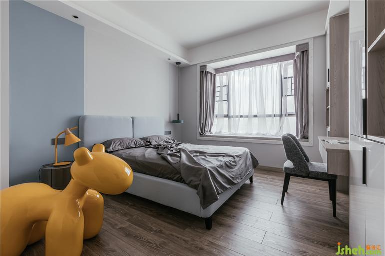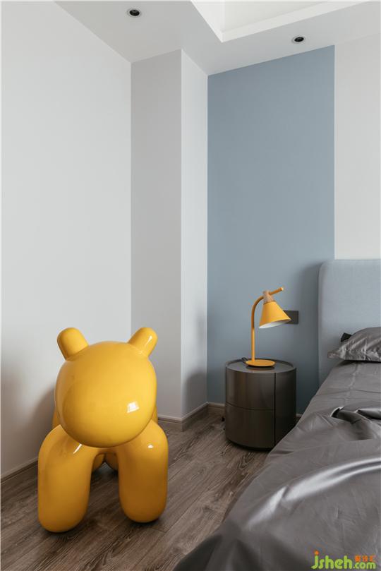 男孩房藍(lán)灰拼色的墻面搭配同色系床,以及創(chuàng)意的網(wǎng)紅座椅體現(xiàn)出空間的童真,使空間層次豐富而更有趣味。