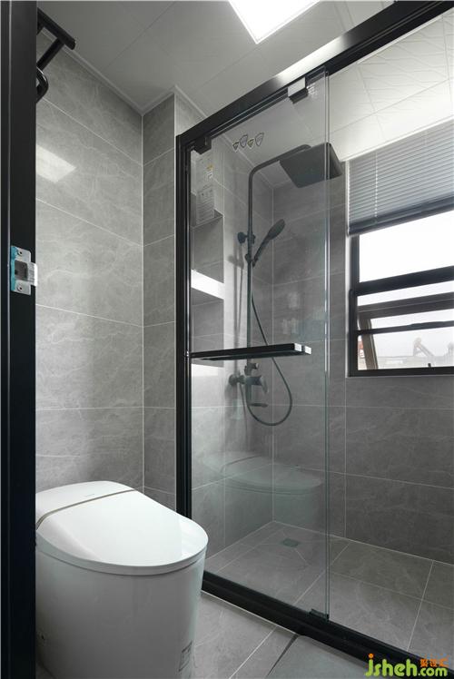 這是客衛(wèi)的照片,墻地磚顏色一體,灰色系。淋浴間有個壁龕可以放沐浴乳之類的哦。