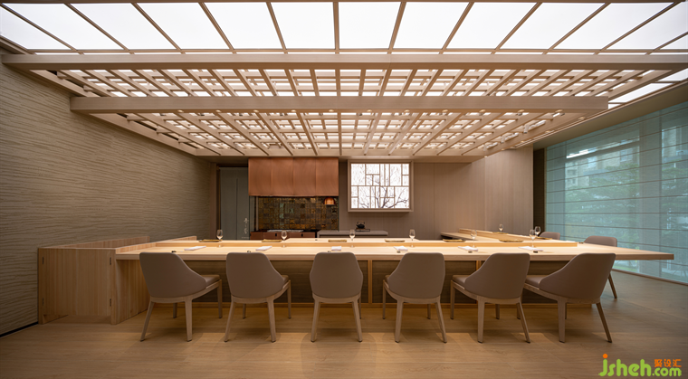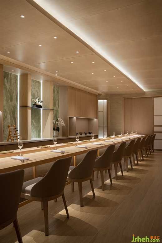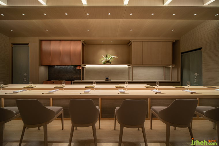 包間中心以開放式廚房結(jié)合壽司臺(tái),日料餐廳設(shè)計(jì)以板前料理形態(tài)服務(wù)。次第排列的弧形椅宛如一座座島嶼,一與十,方與圓,主與客,施與受,空間的起承轉(zhuǎn)合也是人與人、人與物之間關(guān)系的進(jìn)一步詮釋。