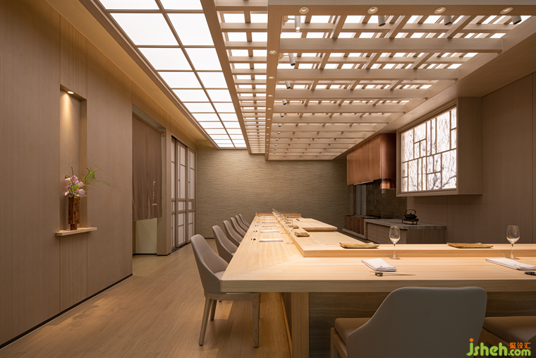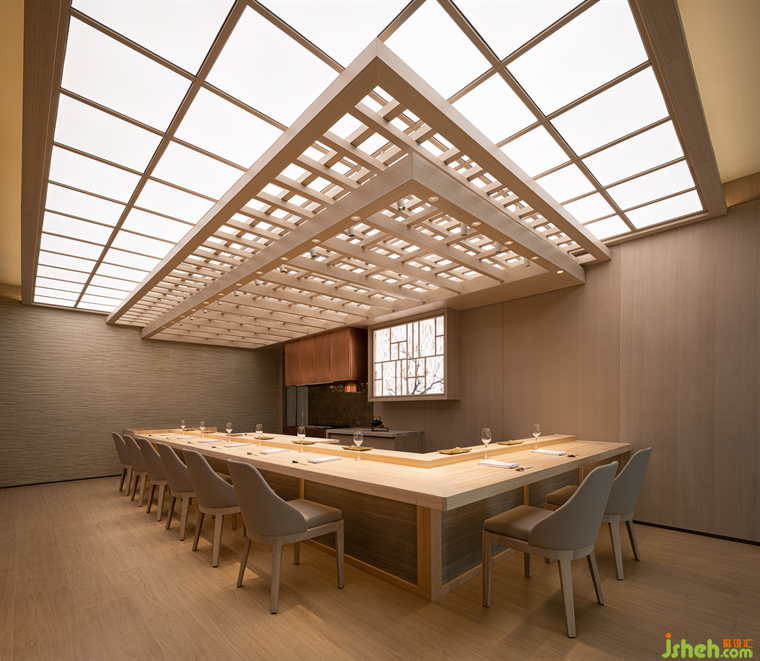 這個(gè)空間充分運(yùn)用了木元素,左側(cè)大面積的假窗設(shè)計(jì)通過與天花的燈光結(jié)合,日料餐廳設(shè)計(jì)巧妙地營(yíng)造出薄霧的效果。其中,三間包房中,假窗最大,通過假窗和天花的燈光結(jié)合,巧妙地營(yíng)造出薄霧的效果。