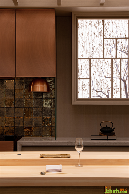 櫻島山上常有濃霧籠罩,我們以這一自然元素為靈感展開空間設(shè)計(jì)?!氨§F”運(yùn)用了藝術(shù)玻璃及通透性材料,青碧如海的玻璃壁龕里花束寂然,與臺(tái)案上的日式插花和日式景觀石相映成趣,極具神秘感。